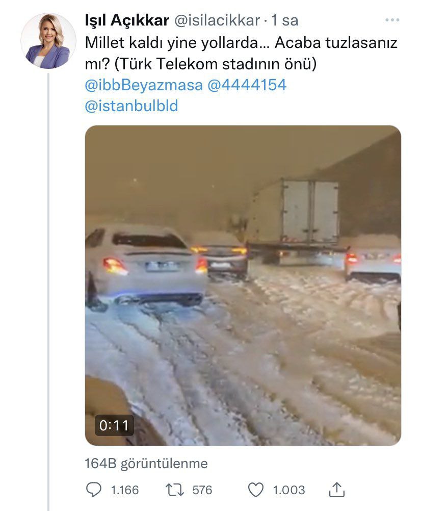 Tarih: 13-03-2022 08:59:46WELG - TRT spikeri Işıl Açıkkar, İstanbul'daki kar yağışının ardından Ulaştırma Bakanlığının sorumluluk alanında bulunan yol için İstanbul Büyükşehir Belediyesini eleştirince sosyal medyada gündem oldu. TRT spikeri Açıkkar Ulaştırma Bakanlığı'nın sorumluluk alanındaki bölge için İBB'yi etiketleyerek “İnsanlar yine yolda kaldı. Acaba tuzlasanız mı?” paylaşımında bulundu.