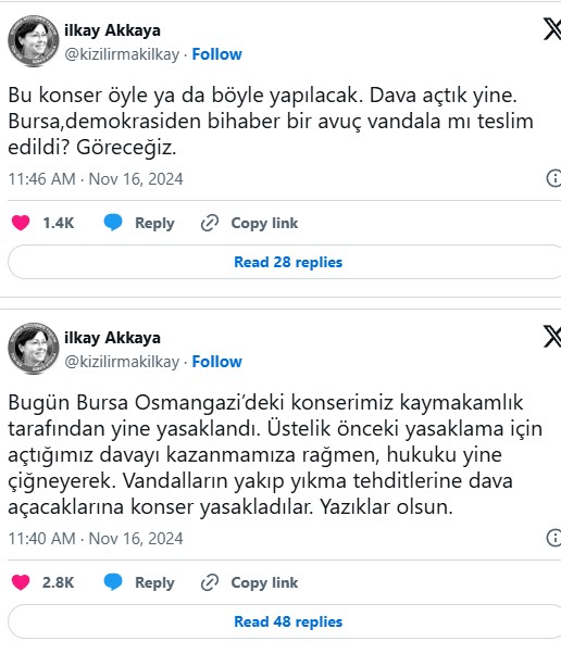 Tarih: 17-11-2024 10:51:54WELG | Sanatçı İlkay Akkaya'nın 16 Kasım 2024 tarihinde Bursa Osmangazi’de planladığı konser, kaymakamlık kararıyla yasaklandı. Sosyal medya hesabından açıklama yapan Akkaya, daha önceki yasağa karşı açtıkları davayı kazanmalarına rağmen konserin yeniden iptal edilmesini sert bir dille eleştirdi. “Vandalların yakıp yıkma tehditlerine dava açacaklarına konser yasakladılar. Yazıklar olsun. Bu konser öyle ya da böyle yapılacak. Dava açtık yine,” diyen Akkaya, tepkisini ortaya koydu.