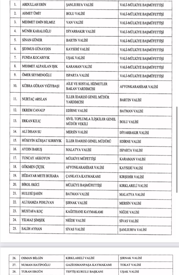 Ayrıca Şanlıurfa Valisi Abdullah Erin, Bolu Valisi Ahmet Ümit, Van Valisi Mehmet Emin Bilmez, Diyarbakır Valisi Münir Karaloğlu, Bartın Valisi Sinan Güner, Kayseri Valisi Şehmus Günaydın, Uşak Valisi Funda Kocabıyık, Karaman Valisi Mehmet Alpaslan Işık ve Isparta Valisi Ömer Seymen valilik görevinden alındı.