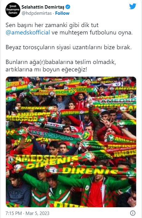 “Sen başını her zamanki gibi dik tut @amedskofficial ve muhteşem futbolunu oyna. Beyaz torosçuların siyasi uzantılarını bize bırak. Bunların ağa(r)babalarına teslim olmadık, artıklarına mı boyun eğeceğiz!”