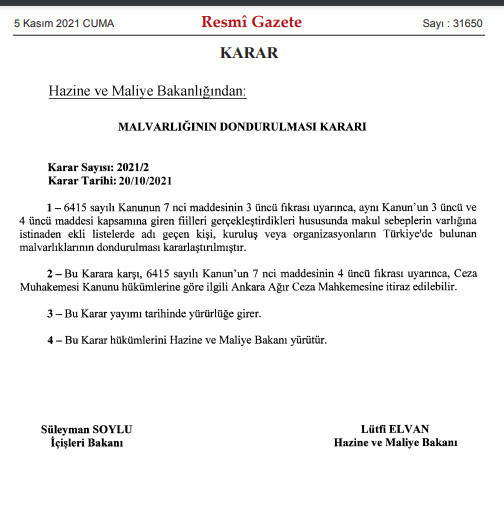 Tarih: 05-11-2021 08:28:27WELG - Resmi Gazete'nin bugünkü sayısında, İçişleri Bakanı Süleyman Soylu ile Hazine ve Maliye Bakanı Lütfi Elvan'ın imzasıyla yayımlanan karara göre, terör örgütüne maddi destek sağlayan 10 kişi ve 3 kuruluşun Türkiye'deki mal varlıkları donduruldu.