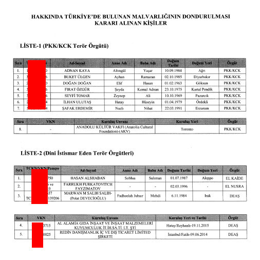6415 sayılı Terörizmin Finansmanının Önlenmesi Hakkında Kanunun 7'nci maddesinin 3'üncü fıkrasınca yayımlanan karara göre; Adnan Kaya, Buket Ülgen, Doğan Doğan, Fırat Özgür, Seyfi Tomar, İlhan Ulutaş, Şafak Erdemir ile Toronto'da kurulan Anadolu Kültür Vakfı'nın mal varlıkları PKK/KCK'ya maddi destek sağladığı gerekçesiyle, Hasan Alshaban'ın mal varlıkları El Kaide'ye destek sağladığı, Farrukh Furkatovitch Fayzımatov'ın mal varlıkları El Nusra'ya destek sağladığı, Marwan M Salıh Salıh'ın, Al Alamia Gıda'nın ve Redin Danışmanlık İç ve Dış Ticaret'in mal varlıkları ise DEAŞ'a destek sağladığı gerekçesiyle dondoruldu.