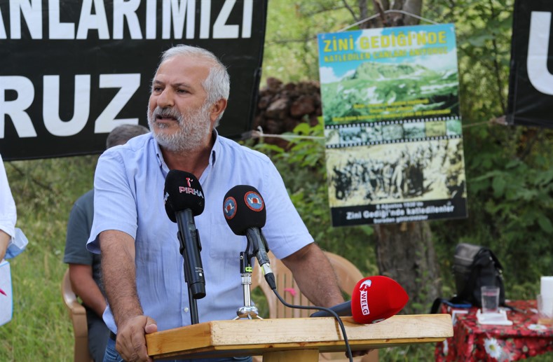 Zini Gediği İnisiyatifi adına anma programının açılış konuşmasını yapan Kenan Düzgünkaya, “8 Ağustos 1938’de herhangi bir sorgulama ve yargılama olmadan köylerinden toplanan 100’e yakın insan aç, susuz bir halde saatlerce yürütülerek Zini Gediği’nde topluca kurşuna dizildi” ifadelerini kullandı.