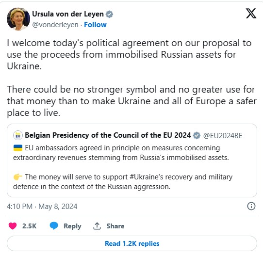 AB üye ülkelerinin büyükelçileri, Brüksel'de düzenlenen bir toplantıda dondurulan Rus varlıklarından elde edilen gelirin Ukrayna'ya yardım için kullanılması konusunda anlaşmaya vardılar. Bu anlaşma çerçevesinde, savaştan zarar gören Ukrayna'ya yaz aylarından önce yaklaşık 3 milyar euro tutarında yardım yapılması öngörülüyor. Bu yardımın, silah alımı ve yeniden yapılanma gibi acil ihtiyaçları karşılamak için kullanılması planlanıyor.