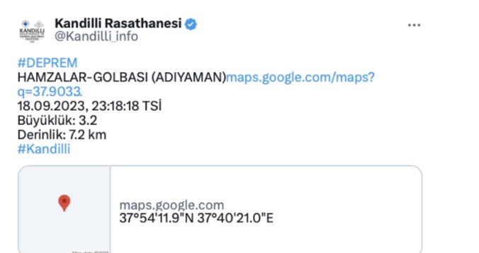 WELG | Kandilli Rasathanesi Adıyaman'ın Gölbaşı ilçesinde 3.2 büyüklüğünde bir deprem meydana geldiğini duyurdu.
