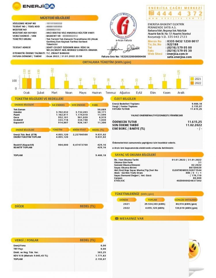 Hacı Bektaş Veli Vakfı’ndan yapılan açıklamada, “Zamlardan sonra gelen elektrik faturamız 11.615,25 TL’dir. Cemevlerinin elektrik faturalarının ticarethane statüsünde gelmesi bu ülkenin ayıbıdır. Bütün canlarımızı tüm cemevlerimizle dayanışmaya bekliyoruz” denildi.
