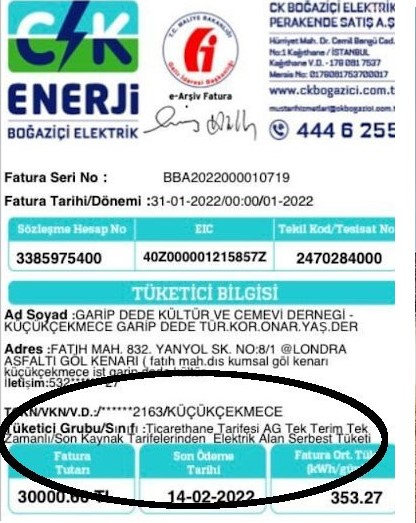 Tarih: 05-02-2022 09:26:54WELG - İstanbul Küçükçekmece’deki Garip Dede Kültür ve Cemevi Derneği’ne 30 bin 60 TL elektrik ve 11 bin 847 TL doğal gaz faturası geldi. CK Boğaziçi Elektrik Perakende Satış isimli şirket tarafından düzenlenen elektrik faturasının 'tüketici grubu/sınıfı' kategorisinde 'ticarethane tarifesi' yazdığı görüldü.