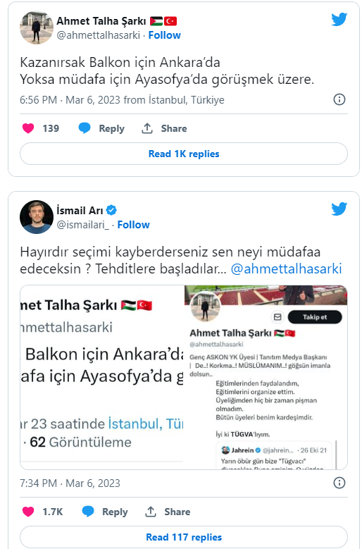 Gazeteci Mehmet Emin Kurnaz, “Tehdide bakın! TÜGVA Genel Merkez de uzun dönem görev yapan şimdi Genç ASKON Genel Merkez Yönetim Kurulu Üyesi olan Ahmet Talha Şarkı, seçimi kaybetmeleri halinde Ayasofya’da müdafaaya geçeceğini ilan ediyor” dedi.
