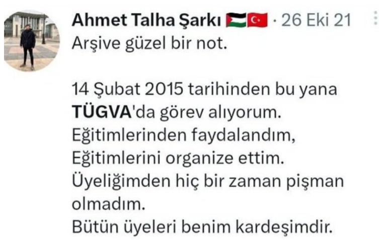 Türkiye Gençlik Vakfı (TÜGVA) ve aynı zaman Genç ASKON yönetim kurulu üyesi Ahmet Talha Şarkı’nın sosyal medyada yaptığı paylaşım tartışmaları da beraberinde getirdi.