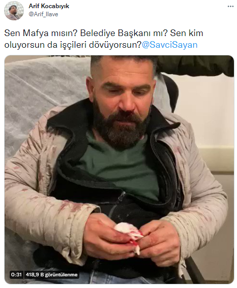 İlave TV sunucusu Arif Kocabıyık sosyal medya hesabından Ağrı Belediye Başkanı Savcı Sayan tarafından darp edildiğini iddia eden bir işçinin görüntülerini paylaştı. Görüntülerde kanlar içinde konuşan işçi, Sayan ve korumalarının kendisini ve formenine şiddet uyguladığını iddia etti.