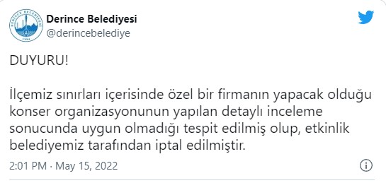 WELG - Belediyenin sosyal medya hesabı üzerinden 20 Mayıs’ta Derince Açık Hava Sahnesi’nde düzenlenecek konserin iptali şöyle duyuruldu: “İlçemiz sınırları içerisinde özel bir firmanın yapacak olduğu konser organizasyonunun yapılan detaylı inceleme sonucunda uygun olmadığı tespit edilmiş olup, etkinlik belediyemiz tarafından iptal edilmiştir.”