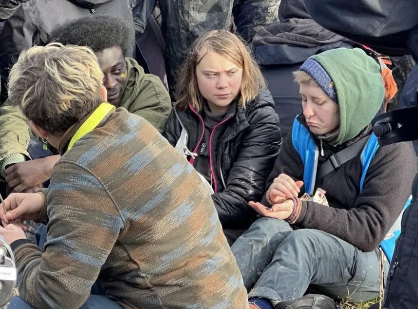 Kıyafetleri çamur içinde kalan Thunberg, polis çemberinde diğer aktivistlerle yemek yerken görüldü.