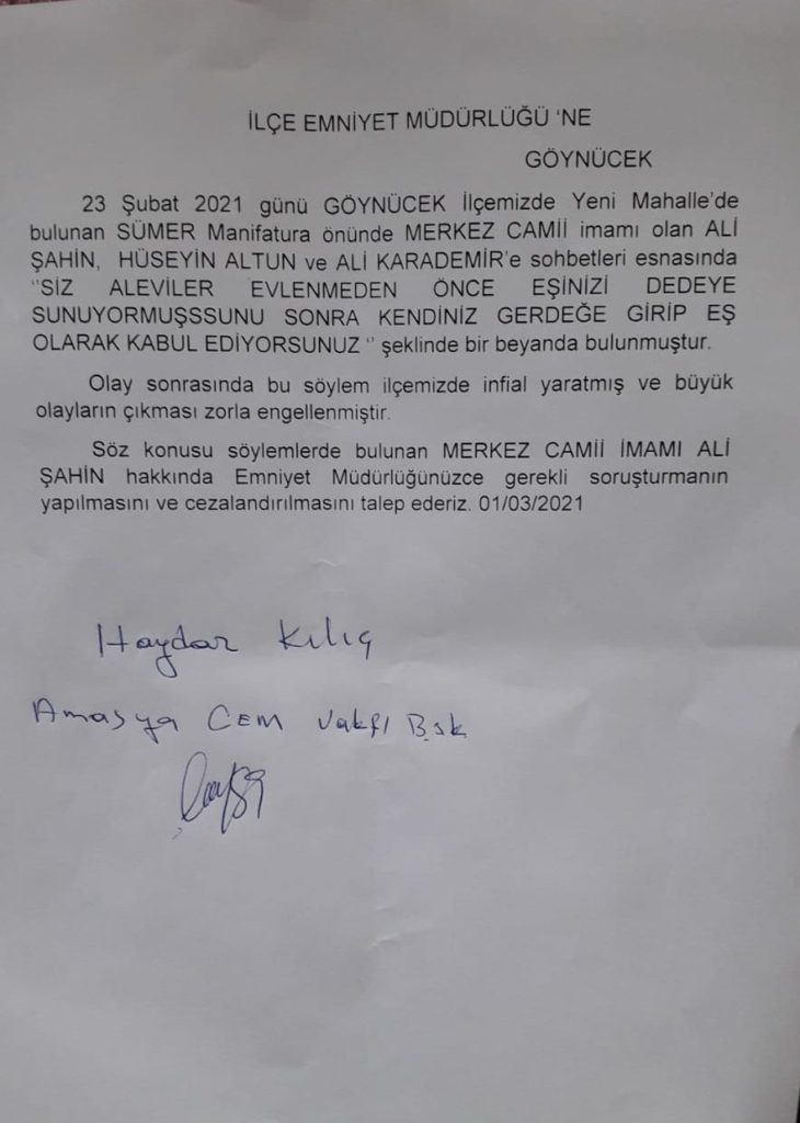 Amasya Göynücek’te, Göynücek Merkez Cami din memuru Alevilere ağır hakaret etmiştir. Bu Göynücek meczubu, Aleviler için “Aleviler düğünden önce eşlerini dedeye teslim ediyorlarmış” demiştir. Bu meczup, Alevilerin de vergisiyle aldığı maaşı yerken hiç tereddüt etmezken Alevilere de hadsizce hakaret etmektedir. Bu Göynücek meczubu hakkında Amasya’daki Alevi kurumlarımız suç duyurusunda bulunmuştur. Şimdi iktidara soruyorum: Hakaret sadece size yapılınca mı hakaret oluyor? Manevi değerlere hakaret sizin için mi geçerli sadece? Dini değerlere hakaret sadece sizin için mi geçerli oluyor? Bu meczuba neden herhangi bir işlem yapılmıyor?