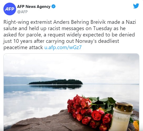 Anders Behring Breivik, bugün çıkarıldığı ve şartlı tahliye talebinde bulunduğu mahkemede yargıçlara Nazi selamı vererek ırkçı söylemlerde bulundu.