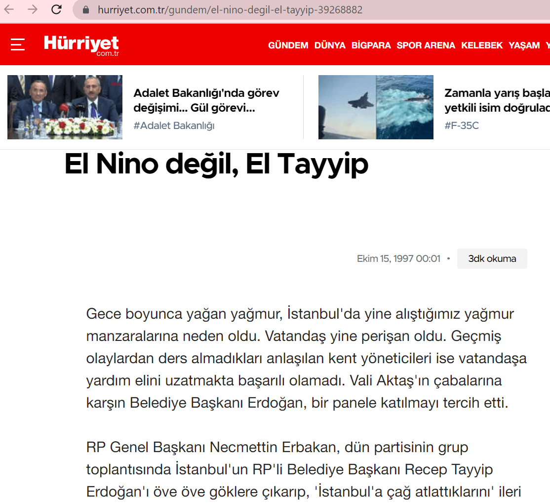 Arşivler Erdoğan’ı yalanladı: 1997 Yılında Hürriyet’in başlığı "El Nino değil El Tayyip"