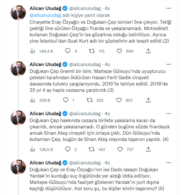 Uludağ, cinayette motosikleti kullanan Doğukan Ç.’nin 2013 yılında Maltepe Gülsuyu’nda uyuşturucu çeteleri tarafından öldürülen Hasan Ferit Gedik cinayeti davasında tutuklu yargılandığını, 2015’te tahliye edildiğini, en sonunda da 35 yıl 4 ay hapis cezasına çaptırıldığını belirtti. Doğukan Ç.’nin hakkında yakalama kararı olmasına rağmen yakalanamadığını söyleyen Uludağ, İstanbul’da gözaltına alınan Ufuk K. ile birlikte cinayetteki MHP bağlantısının ilk kez tespit edildiğini kaydetti.