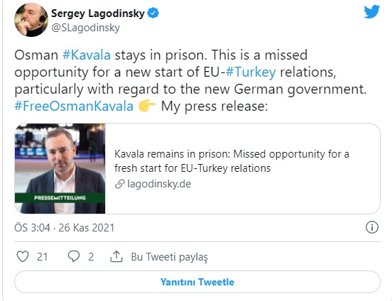 Avrupa Parlamentosu Türkiye Karma Parlamento Komisyonu Eş-Başkanı Sergey Lagodinsky, de sosyal medyadan paylaştığı basın açıklamasında "Osman Kavala hapiste kalmaya devam edecek. Bu Türkiye-Avrupa Birliği ilişkileri, özellikle de yeni Alman hükümeti açısından yeni bir başlangıç için kaçırılmış bir fırsattır" ifadesini kullandı.