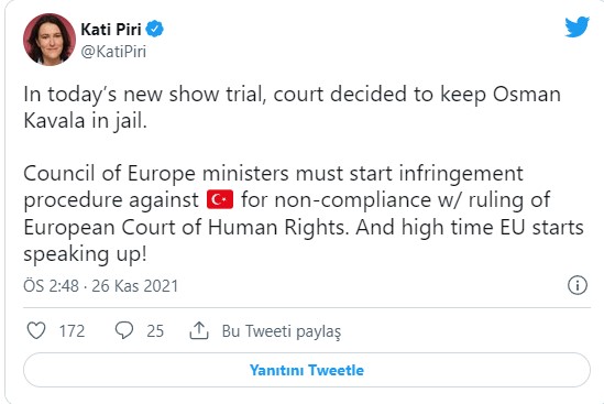 Avrupa Parlamentosu Üyesi Hollandalı vekil ve eski Türkiye Raportörü Kati Piri de sosyal medyadan yaptığı paylaşımda Avrupa Konseyi bakanlarının Türkiye'ye karşı AIHM kararına itaatsizlikten dolayı ihlal sürecinin paylaşılması çağrısında bulundu.