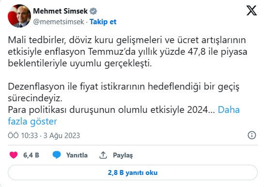 Bakan Şimşek Twitter üzerinden yaptığı açıklamasında, "Mali tedbirler, döviz kuru gelişmeleri ve ücret artışlarının etkisiyle enflasyon Temmuzda yıllık yüzde 47,8 ile piyasa beklentileriyle uyumlu gerçekleşti. Dezenflasyon ile fiyat istikrarının hedeflendiği bir geçiş sürecindeyiz. Para politikası duruşunun olumlu etkisiyle 2024 yılı ortasından itibaren yıllık enflasyon düşmeye başlayacak. Dezenflasyon sürecini mali disiplinle destekleyeceğiz. Politikalarımızın temel amacı orta vadede enflasyonu kalıcı olarak tek hanelere indirmektir" ifadelerini kullandı.