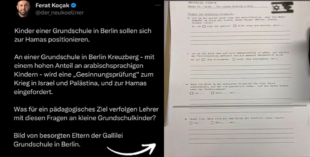 Berlin'de bir ilkokuldaki çocukların Hamas konusundaki tavırlarını öğrenmek için öğretmenler tarafından test yapıldı.