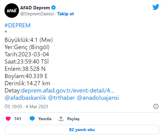 WELG | Afet ve Acil Durum Yönetimi Başkanlığı'nın (AFAD) internet sitesinde yer alan bilgiye göre, Bingöl'ün Genç ilçesinde saat 23.59'da 4,1 büyüklüğünde deprem meydana geldi.