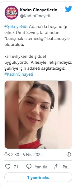Cinayete ilişkin açıklama yapan Kadın Cinayetlerini Durduracağız Platformu, “Şükriye Gür Adana’da boşandığı erkek Ümit Sevinç tarafından “barışmak istemediği” bahanesiyle öldürüldü. Fail evliyken de şiddet uyguluyordu. Ailesiyle iletişimdeyiz, Şükriye için adaleti sağlatacağız.” açıklamasında bulundu.