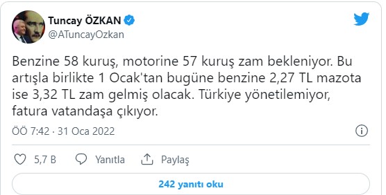 CHP Milletvekili Tuncay Özkan yarın akşam "benzine 58, motorine ise 57 kuruşluk yeni zam" yapılacağını duyurdu. Ekonomist Oğuz Demir ise sosyal medya hesabından yaptığı paylaşımda "hem motorine hem de benzine 45-50 kuruş zam görünüyor" dedi