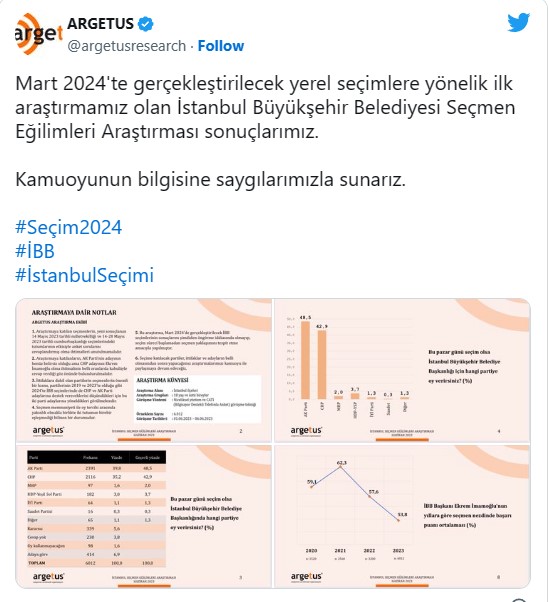 Argetus Araştırma, 1-6 Haziran tarihleri arasında İstanbul'un 39 ilçesinde 6 bin 12 kişi ile yerel seçim anketi yaptı. Argetus Araştırma'nın anketine katılanlara, "Pazar seçim olsa İstanbul Büyükşehir belediye Başkanlığı için hangi partiye oy verirsiniz" sorusu yöneltildi.