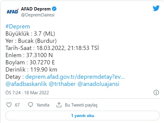 WELG - AFAD'ın internet sitesinde yer alan bilgiye göre; Burdur'un Bucak ilçesinde saat 21.18'de 3,7 büyüklüğünde deprem meydana geldi.