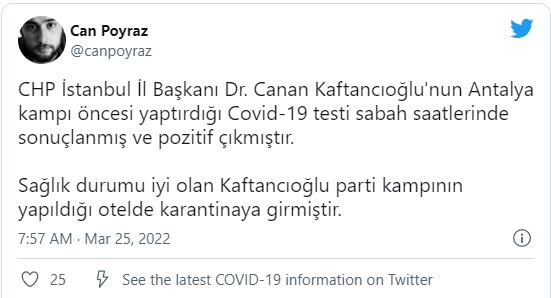"CHP İstanbul İl Başkanı Dr. Canan Kaftancıoğlu'nun Antalya kampı öncesi yaptırdığı Covid-19 testi sabah saatlerinde sonuçlanmış ve pozitif çıkmıştır. Sağlık durumu iyi olan Kaftancıoğlu parti kampının yapıldığı otelde karantinaya girmiştir."