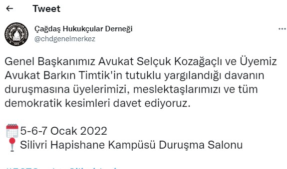 Çağdaş Hukukçular Derneği'nin sosyal medya hesaplarından yapılan bir paylaşımda, 2017'nin eylül ayında gözaltına alınan ve tutuklanan ÇHD üyeleri ve yöneticilerinin, 5, 6 ve 7 Ocak'ta görülecek davaları için çağrıda bulundu.