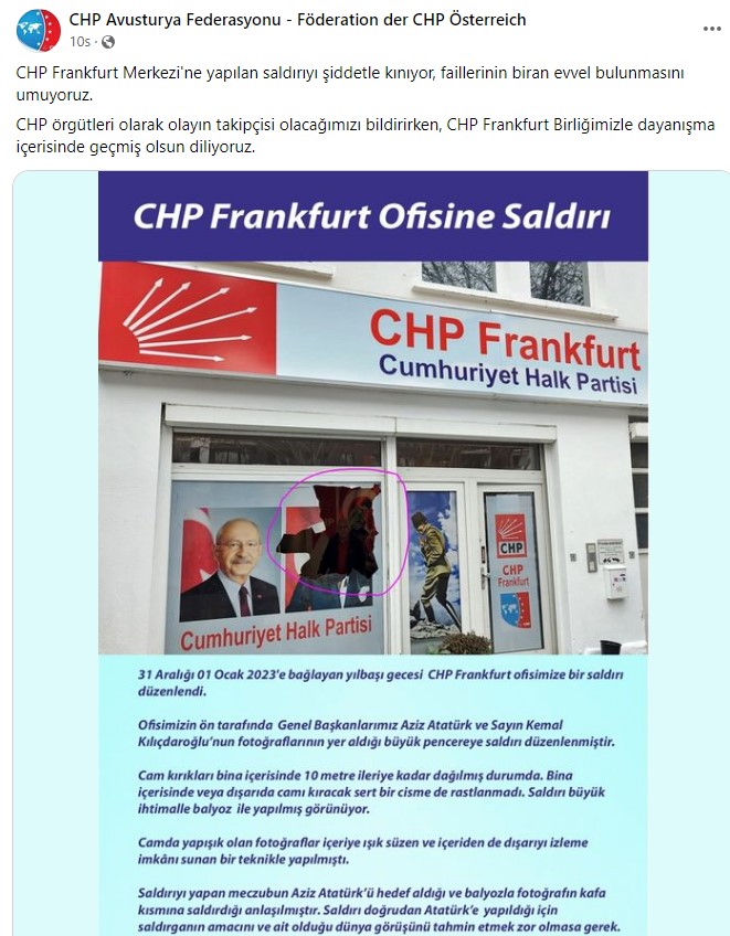 Almanya'nın Frankfurt kentinde faaliyet gösteren Cumhuriyet Halk Partisi (CHP) Frankfurt Birliği'ne ait ofise yılbaşı gecesi bir saldırı düzenlendi.