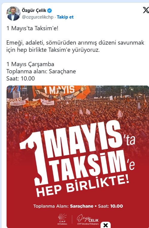 CHP İstanbul İl Başkanı Çelik: 1 Mayıs'ta Taksim'e Yürüyoruz