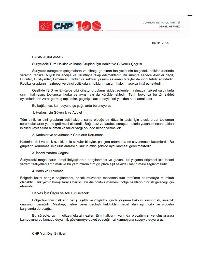 Tarih: 06-01-2025 15:17:08WELG | CHP Yurt Dışı Birlikleri, Suriye’de süregelen çatışmalar ve cihatçı grupların faaliyetleri nedeniyle tehdit altındaki halklar ve inanç grupları için adalet ve güvenlik çağrısında bulundu. Açıklamada, özellikle Aleviler, Dürziler, Hristiyanlar, Ermeniler, Kürtler ve seküler bireylerin ciddi tehlikelerle karşı karşıya olduğu vurgulandı.