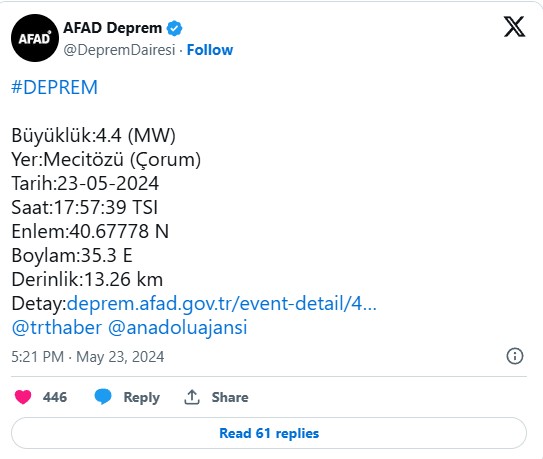 Çorum, Türkiye – Afet ve Acil Durum Yönetimi Başkanlığı (AFAD), Çorum'un Mecitözü ilçesinde 4.4 büyüklüğünde bir deprem meydana geldiğini duyurdu. Deprem, yerin 13.26 kilometre derinliğinde gerçekleşti.