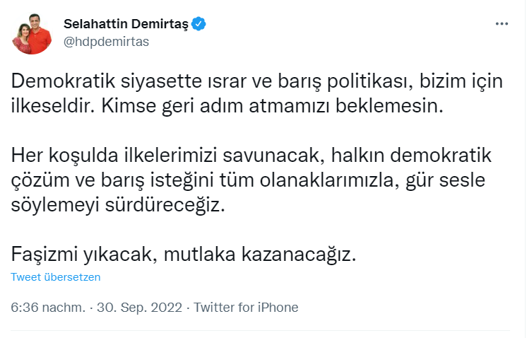 Tarih: 02-10-2022 09:34:15WELG - PKK'nin askeri kanadı HPG'nin üstlendiği saldırıyı, Edirne Cezaevi’nde tutuklu bulunan HDP’nin Eski Eş Genel Başkanı Selahattin Demirtaş, sosyal medya hesabından yaptığı ilk açıklamda sert dille kınamıştı.
