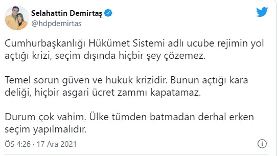 HDP Eski eş genel başkanı Selahattin Demirtaş, sosyal medya hesabından yaptığı paylaşımda erken seçim tartışmalarına değindi. Demirtaş, "Durum çok vahim. Ülke tümden batmadan derhal erken seçim yapılmalıdır" dedi.