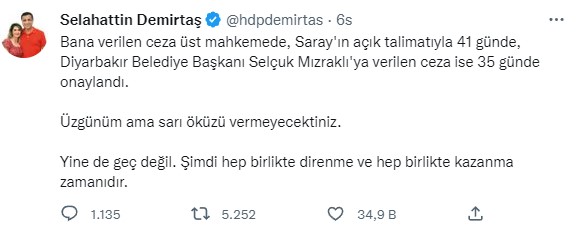 Diyarbakır Belediye Başkanı Selçuk Mızraklı ve kendisine verilen cezaların onaylanma sürelerini hatırlatan Demirtaş mesajında, şu ifadelere yer verdi: