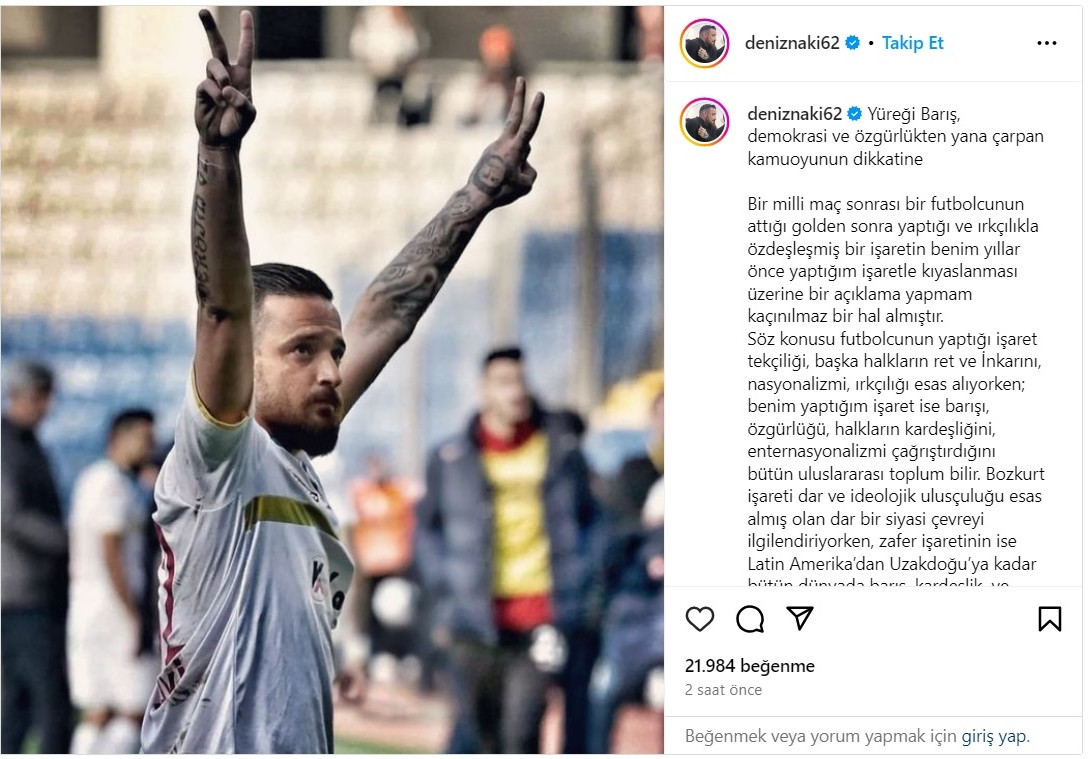WELG | Merih Demiral’ın Türkiye-Avusturya maçında yaptığı "Bozkurt" işaretine yönelik tartışmalar ve tepkiler devam ederken, Deniz Naki de konuya ilişkin sosyal medya hesabından bir açıklama yaptı. Naki, "Yüreği barış, demokrasi ve özgürlükten yana çarpan kamuoyunun dikkatine... Bir milli maç sonrası bir futbolcunun attığı golden sonra yaptığı ve ırkçılıkla özdeşleşmiş bir işaretin benim yıllar önce yaptığım işaretle kıyaslanması üzerine bir açıklama yapmam kaçınılmaz bir hal almıştır" dedi.