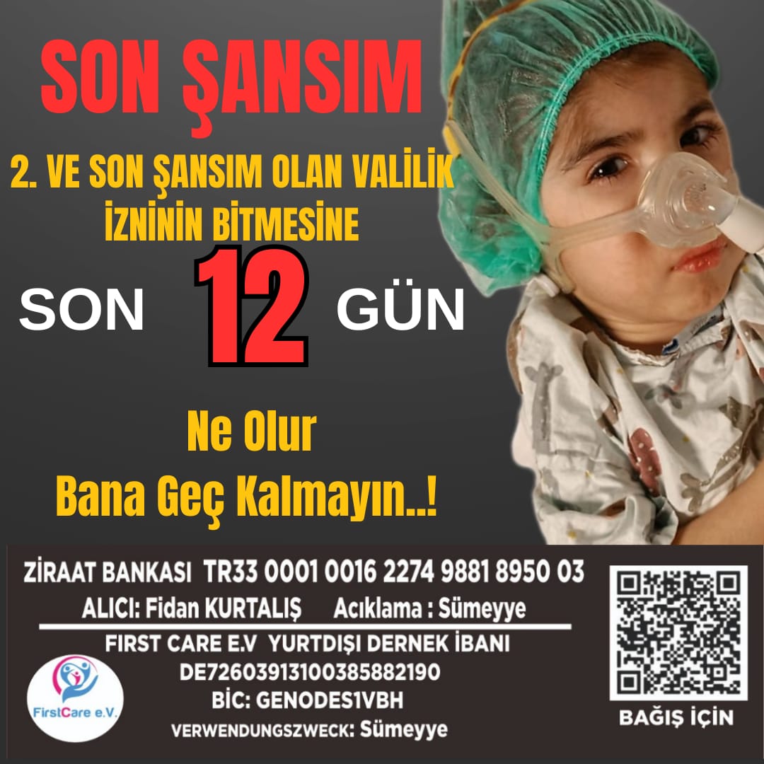 Kalan kısa sürede bu para denkleştirilmezse Sümeyye’nin tedavisi için toplanan para devlete devredilecek ve küçük kızın yaşama şansı kalmayacak.