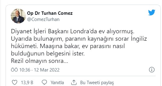 “Diyanet İşleri Başkanı Londra’da ev alıyormuş. Uyarıda bulunayım, paranın kaynağını sorar İngiliz hükümeti. Maaşına bakar, ev parasını nasıl bulduğunun belgesini ister. Rezil olmayın sonra…”
