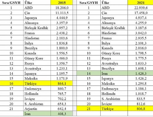 “Son yedi yılda en ciddi değişiklikler olmuş, Türkiye ve Brezilya, son dönemde en fazla ivme kaybı yaşamış ülkeler olurken İran en yüksek çıkışı yakalamış ülke konumuna gelmiş görünüyor. Kişi başına gelir açısından Türkiye 2015 yılında 66’ıncı sıradayken 2021 yılında 78’inci sıraya gerilemiş görünüyor. Son 6 yılda Türkiye’nin hem GSYH hem de kişi başına gelir sıralamasındaki düşüşü son derecede çarpıcı.”