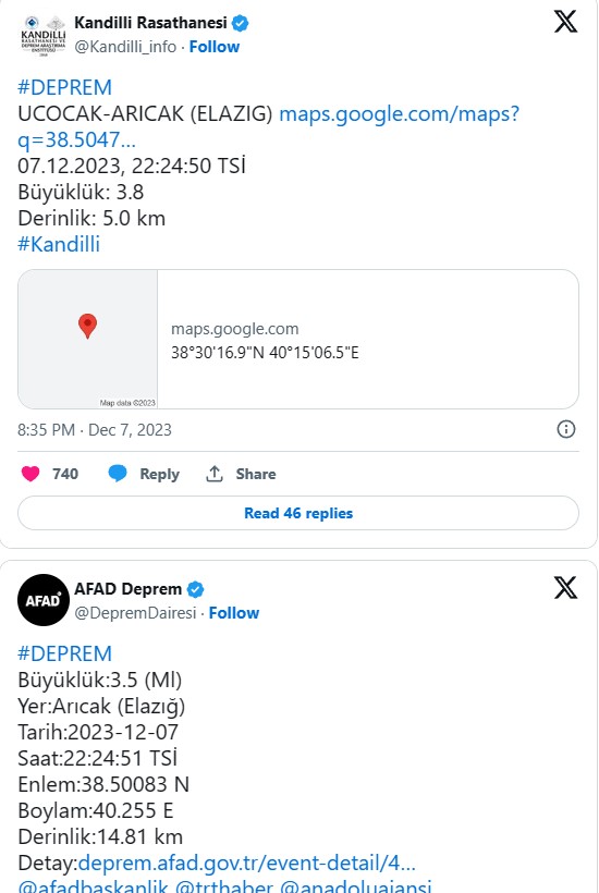 Ancak, AFAD (Afet ve Acil Durum Yönetimi Başkanlığı) ise depremin büyüklüğünü 3.5 olarak açıkladı ve derinliğinin 14.8 kilometre olduğunu bildirdi. Farklı kuruluşların verilerindeki bu küçük farklılık, depremin ölçümlenmesi ve raporlanmasında tipik olarak görülen durumlardan biridir.