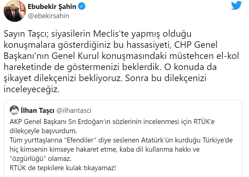 Şahin, Taşçı’nın paylaşımını alıntılayarak; ”Sayın Taşcı; siyasilerin Meclis’te yapmış olduğu konuşmalara gösterdiğiniz bu hassasiyeti, CHP Genel Başkanı’nın Genel Kurul konuşmasındaki müstehcen el-kol hareketinde de göstermenizi beklerdik. O konuda da şikayet dilekçenizi bekliyoruz. Sonra bu dilekçenizi inceleyeceğiz.” ifadelerini kullandı.