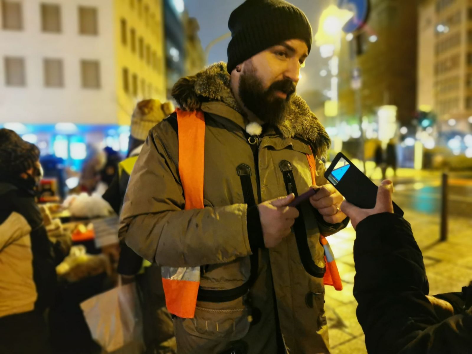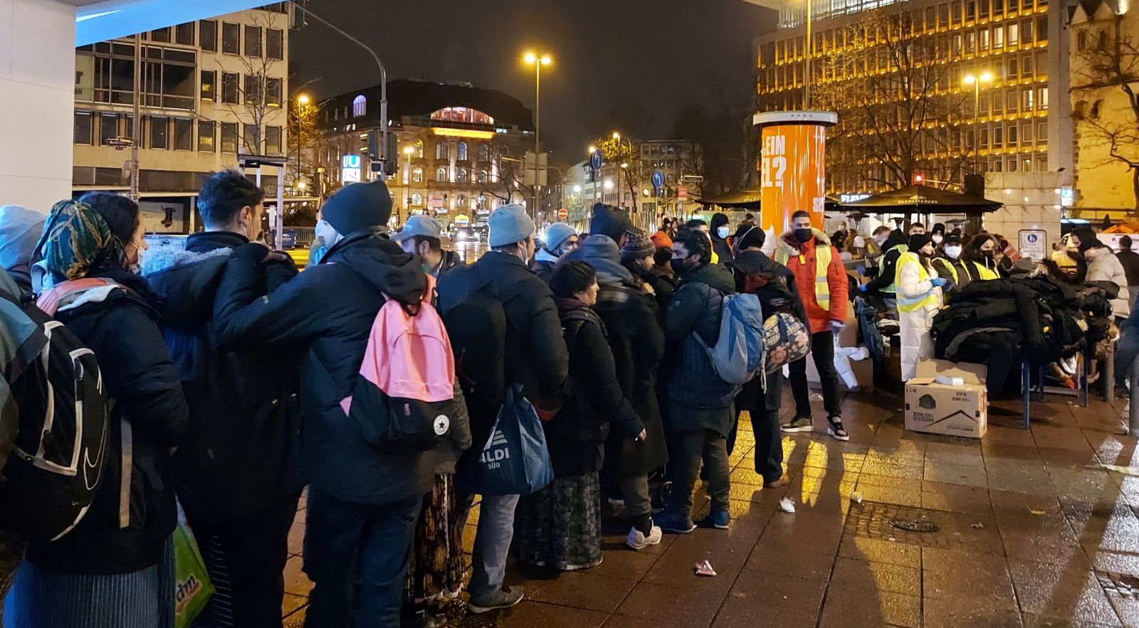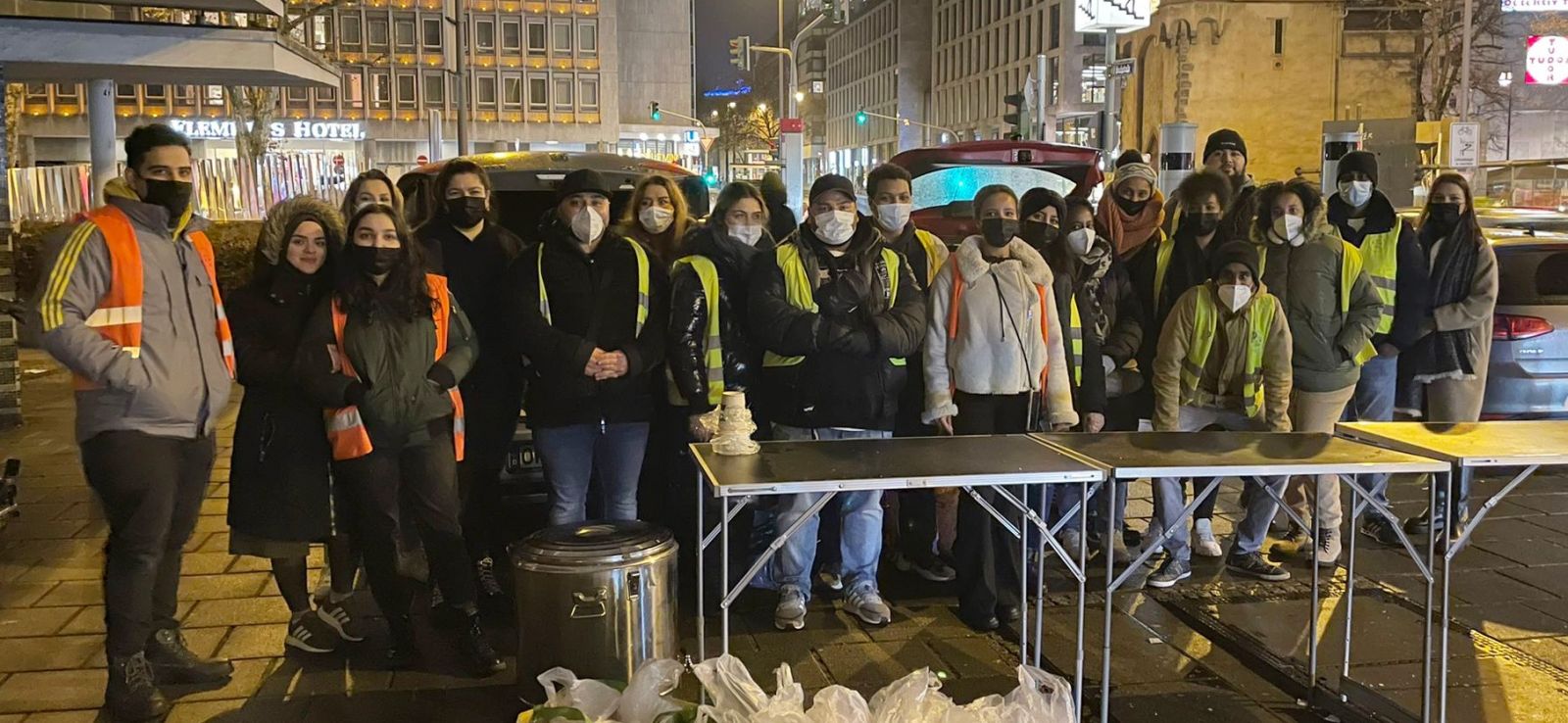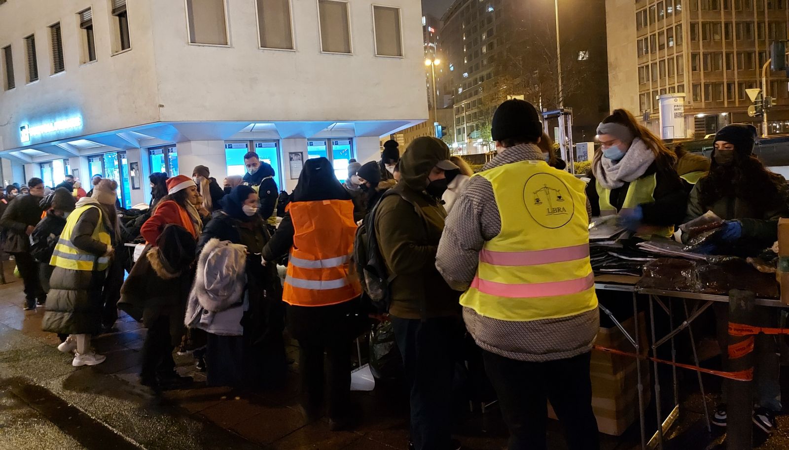 Eschenheimer Tor kulesinin önünde, elli kadar Libra gönüllüsünün kurduğu stantta da paltodan, şapka, yün çorap, atkı, iç çamaşırı, eldivene, botlardan battaniye, uyku tulumu ve hijyenik ürünlere kadar onlarca çeşit giyeceği biraraya getirildi. Frankfurt ve çevresinde konuya duyarlı kişi ve şirketlerin de Libra'ya giyecek ve yiyecek paketleriyle destek verdi. İrland Pub adlı kuruluş hazırladığı yerel, sıcak yemeklerden oluşan menüyü Libra'ya teslim ederken Youtube fenomeni Mr Yasin de evsizlere yüz kadar uyku tulumu hediye etti. Dağıtım sırasında Libra gönüllüleri evsizlere eşlik etti. O sırata stant önünde uzun kuyruk oluşturan evsizler, büyük bir sabırla sıranın kendilerine gelmesini bekledi.