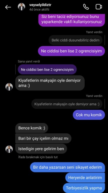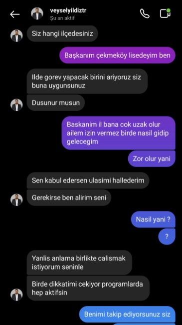 TÜGVA yöneticisi Veysel Yıldız, lise öğrencisine iş teklif etme bahanesiyle buluşma teklif ediyor.