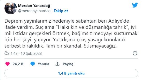 “Deprem yayınlarımız nedeniyle sabahtan beri Adliye'de ifade verdim. Suçlama ‘Halkı kin ve düşmanlığa tahrik’, iyi mi! İktidar gerçekleri örtmek, bağımsız medyayı susturmak için her şeyi yapıyor. Yurtdışına çıkış yasağı konularak serbest bırakıldık. Tam bir skandal. Susmayacağız.”