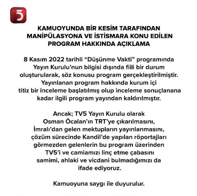 Açıklamanın devamında "Ancak; TV5 Yayın Kurulu olarak Osman Öcalan'ın TRT'ye çıkarılmasını, İmralı'dan gelen mektupların yayınlanmasını, çözüm sürecinde Kandil'de yapılan röportajları görmezden gelenlerin bu program üzerinden TV5'i ve camiamızı linç etme çabasını samimi, ahlaki ve vicdani bulmadığımızı da ifade ediyoruz" denildi.