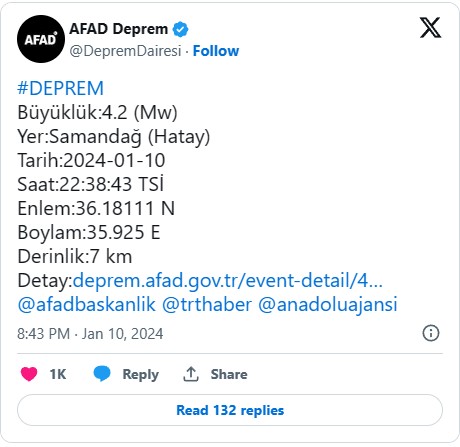 WELG | Afet ve Acil Durum Yönetimi Başkanlığı (AFAD), Hatay'ın Samandağ ilçesinde saat 22.38'de 4,2 büyüklüğünde deprem meydana geldiğini açıkladı.