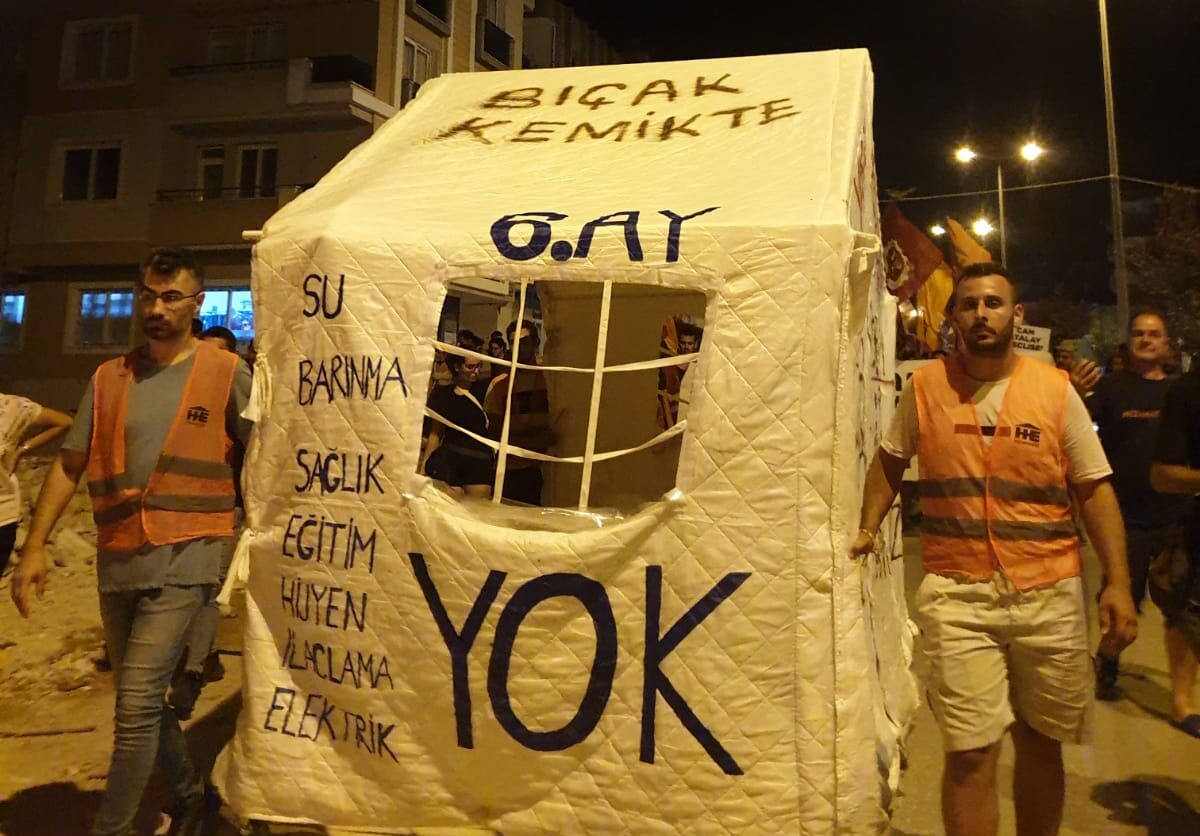 Halkevleri, TİP, TÖP, Kaldıraç’ın çağrısıyla “Yıkımın altıncı ayında haklarımız için yürüyoruz” diyenler renkli pankartları ve dövizleriyle, davullarıyla sloganlarla yürüyüşe geçti. Yürüyüşün en önünde “İnsanca yaşam istiyoruz” pankartı taşındı. “Hatay’ı yeniden kuracağız” sloganıyla Halkevleri Yaşam Meclisi imzalı “Bıçak kemikte. Su, barınma, sağlık, eğitim, hijyen, ilaçlama, elektrik yok” ve “Ne çadır ne toplama kampı mahallemizde nitelikli barınma istiyoruz” yazılı çadırla yürüdüler. Halkevci Kadınlar “Devlet yok dayanışma var” yazılı dövizi taşıdı. Türkiye İşçi Partisi, Hatay Milletvekili Can Atalay’ın fotoğrafları ile “Can Atalay Meclise” yazılı dövizleri taşıdı.